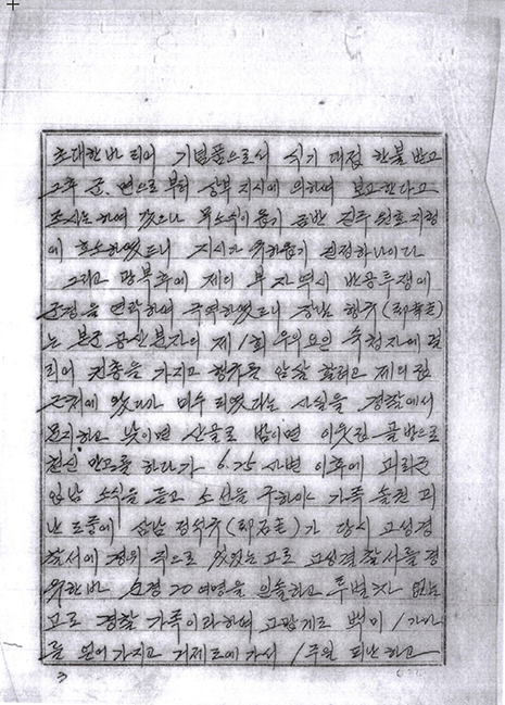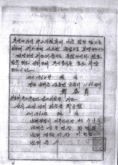 그리고 광복 후에 저의 부자 역시 반공투쟁에 군경을 연락하여 극역하였더니 장남 행규(鄭幸圭)는 본군 공산분자의 제1회 우익요인 숙청자에 걸리어 권총을 가지고 행규를 암살하려고 저의 집 근처에 왔다가 미수되었다는 사실을 경찰에서 문지하고 낮이면 산골로 밤이면 이웃집 골방으로 천신만고를 하다가, 6·25 사변 이후에 괴뢰군 입남 소식을 듣고 소선을 구하여 가족 솔권 피난 도중에 삼남 정석규(鄭石圭)가 당시 고성경찰서에 경위 직으로 있었는 고로 고성경찰서를 경유한 바 순경 20여 명을 인솔하고 투벌차 없는 고로 경찰 가족이라 하여 고맙게도 백미 1가마를 얻어가지고 거제도에 가서 1주일 피난하고 부산에 가서 약 2개월 후에 아군 탈환함으로 인하여 귀가하여 사소한 농업으로 보명하나이다.