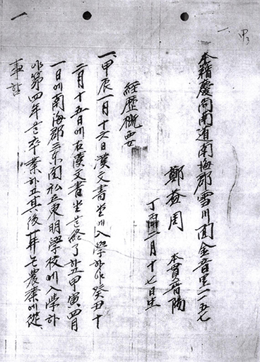 1. 갑진년(1904년) 1월 16일 한문서당에 입학하여 계축년(1913년) 2월 15일에 우(又) 한문서당을 종료하고 갑인년(1914년) 4월 1일에 남해군 삼동면 사립동명학교에 입학하여 제사학년을 졸업하고 그후 20년은 농업에 종사함.