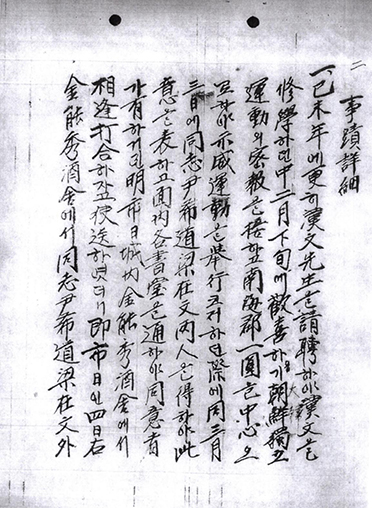 1. 기미년(1919년)에 갱(更)히 한문 선생을 청빙하여 한문을 수학하던 중 2월 하순에 환희하기를 조선독립만세운동의 밀보를 접하고 남해군 일원을 중심으로 하여 시위운동을 거행코저 하던 제에 동 4월[원문은 3월이나 착오로 보여 수정함] 3일에 동지 윤희도(尹希道), 양재문(梁在文), 양인을 득하여 차의를 표하고 면내 각 서당을 통하야 동의자가 유하거든 명시일 성내 김능수(金能秀) 주사(酒舍)에서 상봉 타합하자고 사송(使送)하였더니