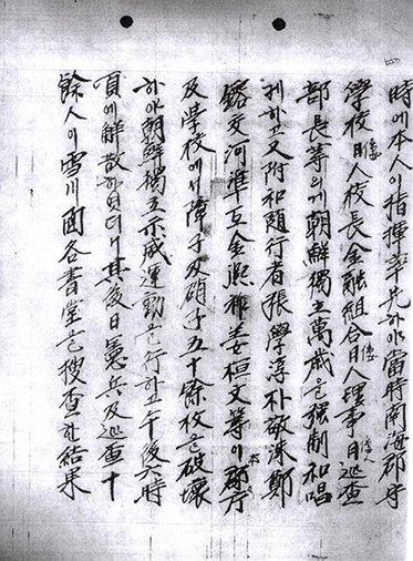 우 부화 수행자 장학순(張學淳), 박경수(朴敬洙), 정용교(鄭鎔交), 하준호(河準互), 김희조(金熙祚), 강환문(姜桓文) 등이 군청 급 학교에서 장자(障子:문) 급(及) 초자(硝子:유리) 오십여 매를 파괴하여 조선독립 시위운동을 행하고 오후 6시경에 해산하였더니