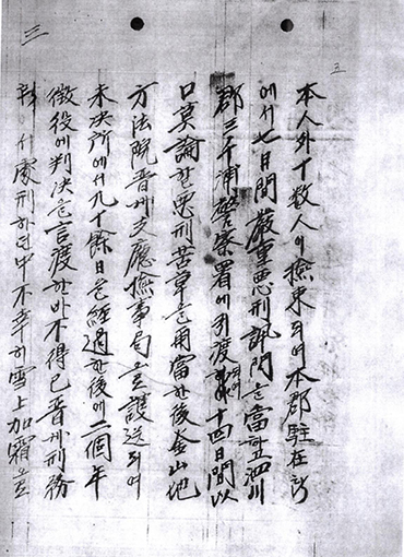 부산지방법원 진주지청 검사국으로 호송되어 미결소에서 구십여일을 경과한 후에 2개년 징역에 판결을 언도한 바 부득이 진주형무소에서 처형(處刑)하던 중 불행히 설상가상으로 학질을 득하여 이십사일간을 일일 고통하던 중 일일은 청약(請藥)하다가 무도한 일인 간수 놈의 발길로 협부를 축(蹴)한 바 되어 약 십분간 기사회생함을 동지에게 문지(聞知)하였으며