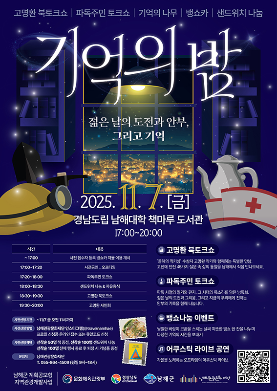 독일마을 기억의 밤 행사가 ‘젊은 날의 도전과 안부, 그리고 기억’이라는 주제로 오는 7일(금) 오후 5시부터 경남도립남해대학 책마루도서관에서 열린다.