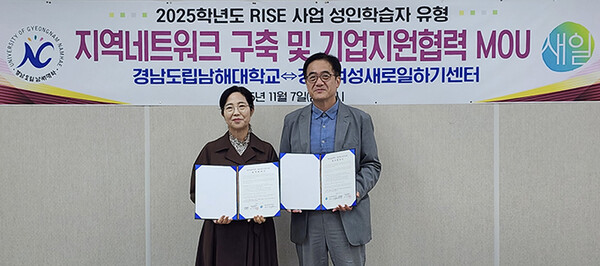 협약에 따라 두 기관은 △경남 지역민, 재취업 희망 여성, 남해대학 재학생 위한 평생학습교육 프로그램 기획과 운영 위한 정보교류 △상호 네트워크 구축을 통한 교육 콘텐츠 개발과 인적 자원 활용 협력 △성인학습자 취·창업 기관 확대와 발굴 협력 등 다양한 공동사업을 추진할 계획이다.